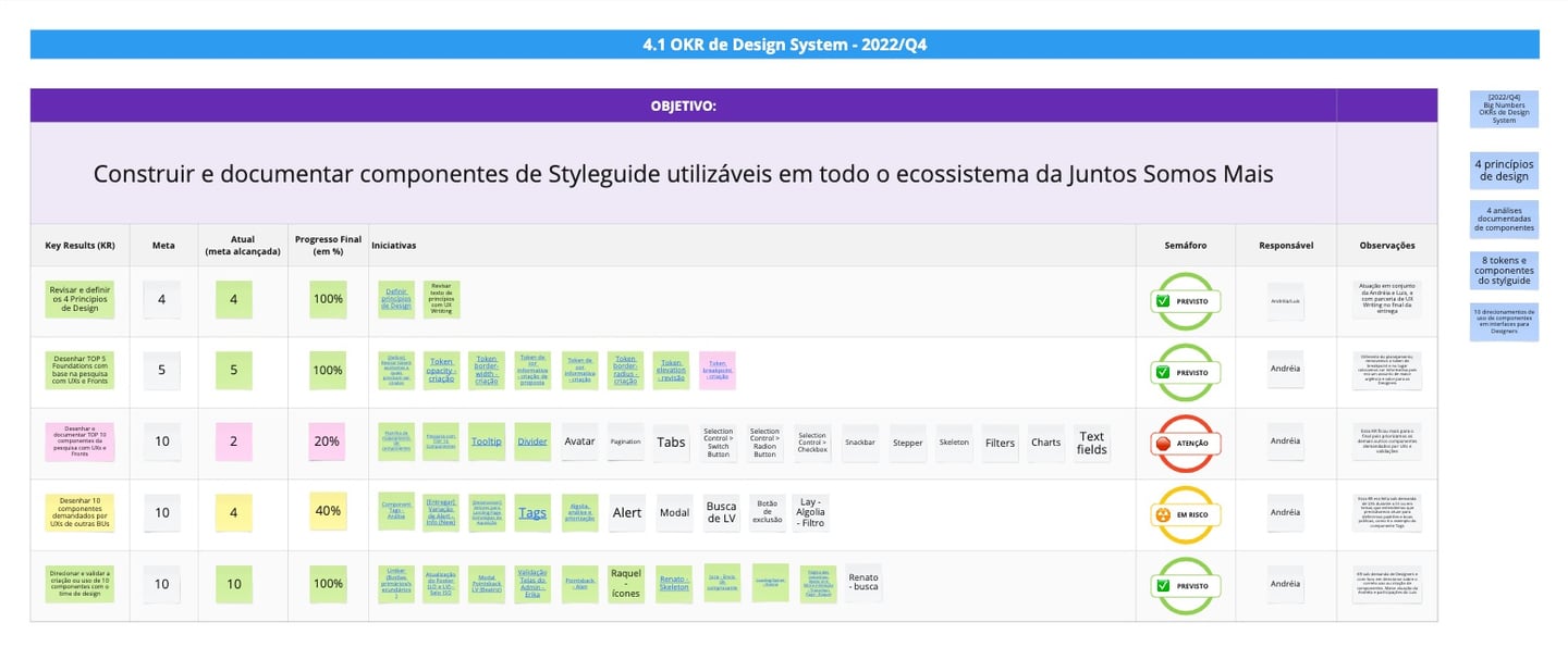 Exemplo de acompanhamento de OKRs e de entregáveis de Design System ao longo do trimestre